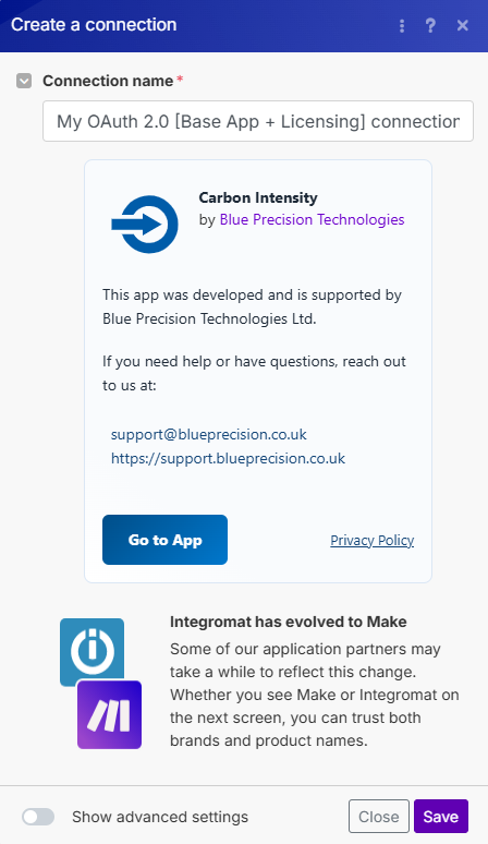 You have successfully established the connection. You can now edit your scenario and add more Carbon Intensity modules. If your connection requires reauthorization at any point, follow the connection renewal steps here .