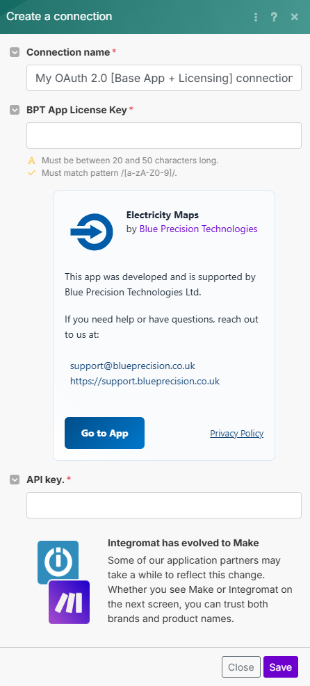 To establish the connection in Make Insert a Electricity Maps module into a scenario. Under Connection, click “Create a connection.
